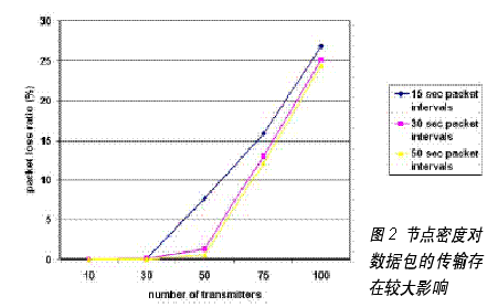 (2)节点密度对数据包的传输存在较大影响(如图2 )。节点在50个以内,数据包时间间隔在30s以上丢包率1%以下。这表明如何让节点密度、数据包间隔时间满足应用的要求,对ZigBee无线传输成功应用于现场层设备是一个巨大挑战。需要进一步研究开发的问题有:在多跳网络中保证合理的延迟,稳健的控制算法(如为减少功耗,让节点保持同步休眠的网络同步算法)。