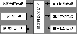 电暖气控制器的总体结构如图1所示。控制器以PIC16C72单片机为控制核心,根据入口和出口水的温度来控制加热和起泵,从而控制暖气的的温度。一上电,当出口温度ToutTout>Tb时起泵3s,让水循环;入口温度Tin>Tt时停泵、停加热;Tout>Ta时停泵、停加热并声光报警9s,