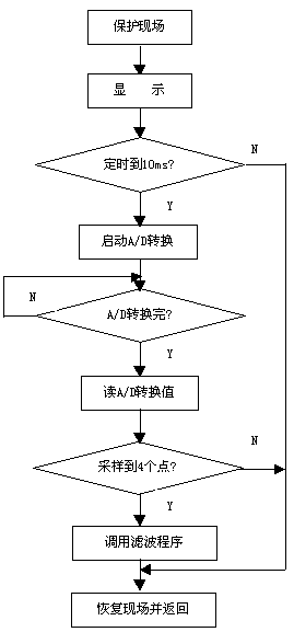 定时时间间隔设为5ms,完成选定档位的动态显示,每10ms启动一次A/D转换,分别采样入口和出口温度值;为了滤除干扰,当采样到4个值时,采用中值加算术平均值滤波法滤波作为一次采样的值,因此,入口和出口水的温度每80ms更新一次。中断服务程序流程图如图4所示: