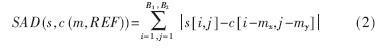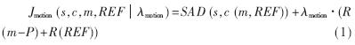 其中m=(mx,my)T表示某个运动矢量,REF表示某个参考帧,Jmotion(s,c,m,REF\f1λMotion)表示在运动矢量m和参考帧REF下的率失真成本,s为原始的视频信号,c(m,REF)为在运动矢量m和参考帧REF下的重构视频信号,λmotion为拉格朗日乘子,R(m-P)表示编码运动矢量m的比特数,R(REF)表示编码参考帧REF的比特数,SAD(s,c,m,REF)(Sum Absolute Difference)为原始信号和重构信号之间的绝对差和,采用(2)式计算: