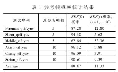 为了进一步了解不同参考帧在实际视频序列中被采纳的情况,本文选择了几个典型的视频测试序列,并利用拉格朗日率失真最优搜索策略,在不同参考帧数条件下统计不同参考帧的被选中概率,实验数据如表1所示。从表1可以看出,在所有参考帧,REF(0)成为最优参考帧的概率最高,概率高达88.67%,而其余所有参考帧被选中的概率远远小于REF(0)。