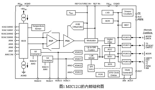 MSC1212的内部结构图如图1所示。MSC1212工作电压2.7 V~5.25V,微控制器核是经过优化的8051内核,在给定时钟源的情况下,它的执行速度比标准的8051内核快三倍,从而使得器件可以在更低的外部时钟频率下工作,在功耗比标准的8051低的情况下,仍可达到相同的性能。同时,其片内外设十分丰富,包括32位累加器、1个带有FIFO的SPI串口、2 个全双工的UART、32个数字输入输出端、看门狗定时器、低电压检测、片内上电复位、16位PWM、3个定时器/计数器、21个中断源。