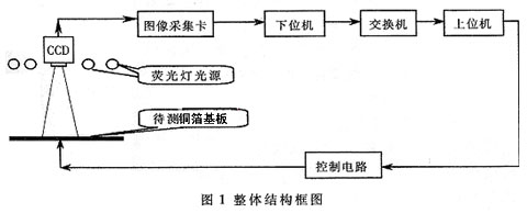 铜箔基板表面光滑,有很强的光反射能力,为获得清晰的表面图像,需谨慎配备光源。本系统中多只荧光灯置于基板上方,以产生均匀温反射光,这样面阵CCD摄像机可以拍到清晰的目标图像。检测系统主要部件的构成如图1所示。