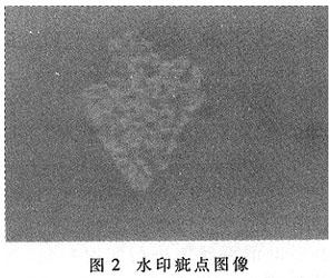 铜箔基板疵点的形成有多种因素,如人为造成的污点、油滴、水印等,或生产过程中产生的划痕、折边等缺陷。本文以水印疵点为例进行疵点的图像处理与识别,经过5点中值滤波预处理后的图像如图2所示。