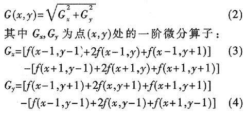 目前已经提出了如Sobel算子、Prewitt算子、Lapalas算法、Kirsch算子等多种有效的边缘提取算子。Sobel边缘检测算子有较低的计算代价,容易实现,是常用的一种梯度算子。其算法描述如下(G(x,y)为每点的梯度幅值):