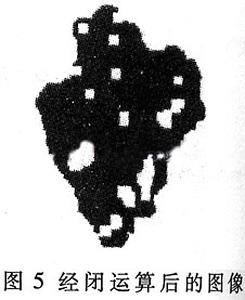 图5为经膨胀-腐蚀这一闭运算后的效果图,可见缺损的轮廓得到补偿,同时不产生全局的几何失真,疵点边界得到明显改善。对象的轮廓信息可以通过计算疵点区域像素覆盖的面积、长、宽、周长、圆形度等特征参数得到。