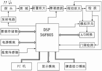 超声回波信号非常微弱,一般是毫伏级,所以必须放大,为了与超声波换能器的高阻抗匹配,前置放大器也设计成高阻抗输入。在探头和前置放大器之间加一级衰减器是为了防止由于某些原因,回波电压过大,容易对仪器造成损害。滤波电路设计成带通滤波,由于探头的频率范围比较宽,不同探头发射频率不同,所以要求带通滤波的中心频率可调,由DSP来控制。这一级要求高信噪比和高品质因数,经过带通滤波器后,回波信号得到放大,而其它噪声被削弱,同时,为下一级的程控放大提供了具有更高信噪比的输入信号。程控放大器主要是针对测距的远近两档来设计的,由于换能器发射能量一定,当测量近距离时,回波信号能量大,这时接收器放大倍数应该小些,而测量远距离时,回波信号能量小,接收放大倍数就应该大些。程控放大器由DSP来控制放大倍数,使得测距时远近两档放大后的信号幅值保持在一个数量级。另外,在探伤时,不同的介质对超声波能量的衰减也不同,可通过手动或自动方式来调整放大器的放大倍数,以达到回波信号的正确接收和显示。