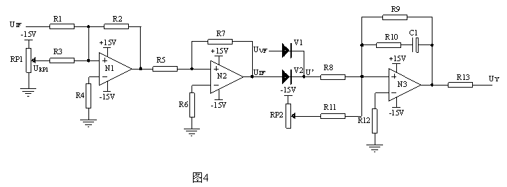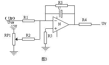 调节单元的构成及原理如图3所示。图中Uvf为装置Uif为装置输出电压或电流反馈信号。当只有电压反馈Uvf时,整流装置工作在恒压状态下;当只有电流反馈UIf时,装置工作在恒流状态下。R1、R3、R5、C、N构成了PI调节器。PI调节器输出Uy与电压反馈Uvf之间的关系为: