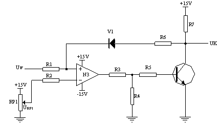 图6中,R1,R2,N组成比较器,通过RP1来设置过流保护值;V1为钳位二极管,Uk为可控硅触发脉冲输出的控制信号。当整流装置输出电流超出额定值的20%时,电流反馈UIF>URP1,则比较器输出为“0”电平,使三极管V2截止,此时Uk为“1”电平,使整流装置输出电压为0。钳位二极管V1保证系统在出现过流时,比较器输出电位为“0”电平,使整流装置可靠关断。