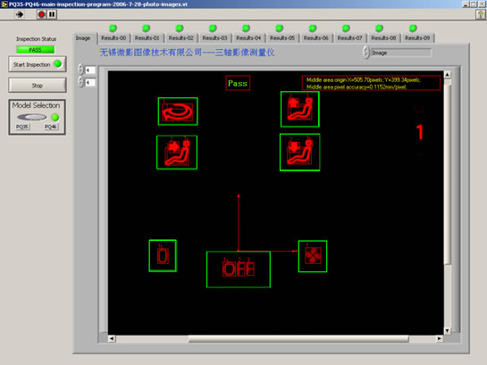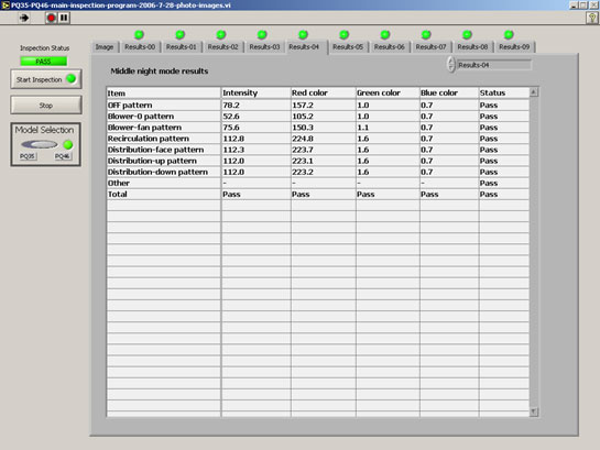 测量结果包括图像和数据,放在一个Table容器中。Table的第一个Page用来存放图像。图像以二维数组为容器,分为9行5列,存放45幅图像,包含9幅采集的图像和抽取的36幅分量图层。Table的第2"11共10个Page用来存放测量数据,分别以10张表格形式输出,分别对应9幅采集的图像的测量数据和重要特征的全局比较。每个Page上有一个布尔量显示控件,用于指示当前页面的综合判断结果。