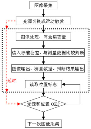 采集图像前要求所有运动静止、光源稳定发光。由计算机向PLC发送运动触发信号和光源切换触发信号的指令完成时间是以10ms为数量级的,而图像处理、图像输出、测量结果输出、写全局变量的完成时间是以100ms为数量级的。运动是否完成可通过读取PLC中的标志位来确定,但光源是否稳定发光,只能依赖上电后的延迟时间。我们的经验是LED光源从上电到稳定发光至少需要500ms的延时。在一个产品的测试中需要9次光源切换、4次位置运动。如果都用延时的方法,那么将大大降低检测速度。所以我们不是在图像采集后立刻对该幅图像处理,而是先为下一次图像采集做光源切换或运动触发,然后再对本次采集的图像做相对费时的图像处理等,相当于为光源切换或运动触发作了延时处理,但又不占用额外的时间开销。参考以下流程图: