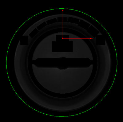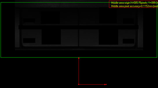 Overlay是叠加在图像上的一个特殊的图层,用于显示ROI定义范围、坐标系定义和部分图像处理的信息。本系统中在同一位置采集的不同光源照明下的3幅图像,具有相同的坐标系和像素精度,不必每次都做同样的处理,只需将第一幅图像上的Overlay传递给其他两幅图像即可。利用我们编写的Overlay传递vi,可以抽取任意image buffer的Overlay并传递到指定的image buffer中。参考图2、图4、图6,每幅图像上的左上角红色方框内的原点坐标位置及像素精度的文字信息和图像中央位置的坐标系标志就是通过这种方法传递的。