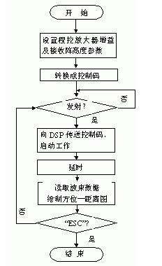 该程序负责启动接收机工作,并完成14个波束的方位—距离数据显示,它首先将输入的增益值及波束号转换为控制码,然后以程序询问的方式认知发射机同步信号的到来,如接收到发射机同步信号,则控制接收机进入工作状态,并将控制码写入接收机控制寄存器的指定位,最后将该次发射所得处理结果显示输出,直至用户按“ESC”键停止程序的运行。