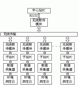 远程环境监测系统主要是对酸雨,水质,烟雾浓度等环境参数进行集中测量,它是一种由中心站PC机、无线数传模块与子站PC机、无线数传模块、数据采集器、环境测定仪所组成的主从式系统。系统结构如图1所示。