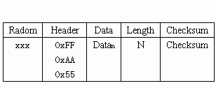 经过测试和试验,发现0xFF 后跟0XAA,0x55 在噪声中不容易发生,所以设置传输协议在数据包前加开始字节0xFF 后跟0xAA,0x55发送。因为第一个字节的数椐在发送时容易丢失,所以在协议的开始加一个任意内容的字节,然后是0xFF 后跟一个0xAA,0x55;接收协议规定只接收以0xFF 后跟0xAA,0x55 开始的包.于是就可以很方便的把以上系统的数据包格式定为以上格式。