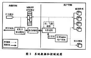 系统软件的主要作用就是与配套的硬件相互协调工作完成中频检前信号实时记录和事后回放。他分成视频采集卡驱动模块、主控进程、记录/回放进程和用户界面。其中视频采集卡驱动模块作为驱动程序以模块的形式插入内核空间运行,由于用户空间进程不能直接访问底层硬件设备,所以驱动模块是上层应用程序和设备物理层之间的桥梁,上层应用程序不必关心硬件设备的具体信息,即可通过RT-Linux的指令FIFO完成对视频采集卡的控制。驱动模块负责完成对视频采集卡的设置、控制和状态采集,以及定时读取视频采集卡内的B码值和锁定标志。上层应用程序也可通过指令FIFO来设置视频采集卡内的B码值。视频数据采集卡模块和上层应用之间通过RT-Linux的共享内存来共享系统的关键性状态、控制数据,实现内核态和用户态程序的数据共享。主控进程为用户空间的普通Linux进程,他负责完成系统的初始化、维护和指令传输等任务。完成用户空间程序到内核空间程序间的指令传递。他多处于等待状态,当接收到来自用户(X-Window窗口界面或文本调试界面)的指令(通过信号量实现)时,经过FIFO发给内核进程,实现指令的传递。同时当他发送启动采集/回放命令后,会负责创建独立的读/写盘进程,来实现数据的硬盘记录和回放。主控进程维护了一个初始的系统配置参数文件,系统停止运行后,他会保存系统的当前状态,在系统再次启动时用于初始化系统参数,同时主控进程在每次启动时会对盘阵上的任务文件进行修复,以保证因停电等意外故障导致的关机发生时,对没有结束的任务文件进行修复。记录/回放进程被主控进程创建后,便不断地在硬盘和采集缓存间(MBUFF)传输数据,记录时只要采集缓存(MBUFF)有数据,他就将数据写入硬盘阵列中。而回放时他首先将回放的数据填满采集缓存(MBUFF),然后当数据被DMA传送完成后,再次读取硬盘阵列中数据,将空出的采集缓存(MBUFF)填满。当记录/回放停止后,该进程自动结束。用户界面是基于X-window的用户进程。他以窗口的形式提供给用户一可视的操控平台,实时显示系统状态、任务内容信息和盘阵空间使用状态,接受用户如下指令:B码设置/显示、开始记录、盘阵上任务文件的回放、改名、转储、删除及数据正确性校验等管理性功能。当用户启动开始采集记录时,控制命令发给主控进程,主控进程建立一个写盘进程,同时将采集命令通过指令FIFO发给底层的视频采集卡,使视频采集设备开始采集数据。视频采集设备会连续的采集输入的中频检前信号流数据到的视频采集卡内的乒乓缓存内,当乒乓缓存缓存满时,他会切换到另一片乒乓缓存继续采集数据,同时会产生一个数据就绪中断,触发系统的中断服务程序。中断服务程序启动一次DMA传输将乒乓缓存内的数据依次传输到采集缓存(MBUFF)内,并调整下一次存储数据的采集缓存(MBUFF)指针,使采集数据在这里暂存且不被覆盖。而写盘进程实时的检测采集缓存(MBUFF)内是否有新采集的数据,如果有会马上写入的硬盘阵列中,512 MB的采集缓存(MBUFF),保证了采集数据未被覆盖前既被写入到盘阵。同样的,当回放时,预先将盘上的回放数据读到缓存内,再发送回放命令,这样即使读盘速度暂时降低,也可以保证缓存内有足够的回放数据被输出到视频采集卡,保证了回放的连续性。
