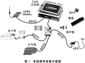 无线通信设备采用GPRS Modem。该GPRS Modem通过Liod板的串行口COM1发送和接收数据;GPS定位采用12通道定位模块GARMIN-15L;打印机采用TD58热敏打印机;电子秤采用应变片压力传感器结合C8051F020单片机自行开发;语音提示模块直接使用Liod板提供的音频接口。由于GPS接收模块、热敏打印机、电子秤都要通过串行口与Liod板通信,Liod板原有的串口数量已经无法满足要求,因此采用ZNE-100T以太网转串口模块,把Liod板的以太网口扩充成3个串行口。系统的硬件连接如图1所示。