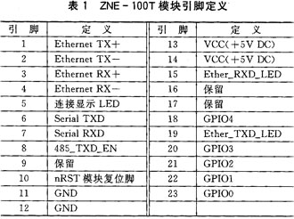 该电路的核心转换部分采用ZNE-100T网络模块。经过该电路的转换,对串口的操作映射为通过以太网进行的数据发送和接收。ZNE-100T模块引脚定义如表1所列。