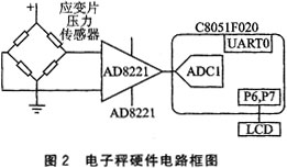 电子秤使用应变片压力传感器、AD8221运算放大器和C8051F020芯片进行设计。电子秤硬件电路框图如图2所示。