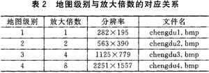 根据设计要求,本终端的电子地图支持4级缩放。设计中采用一幅大小为2 251×1 557、格式为BMP的成都地图作为原始地图,即所能支持的最大分辨率的地图。把缩小8倍以后的地图作为所能支持的最小分辨率地图,因此地图级别与放大倍数之间具有如表2所列的对应关系。