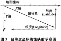 就车载终端而言,所覆盖的地理范围相对地球半径来说几乎无穷小,故可以认为该电子地图所对应的经纬度坐标是线性变化的,即地图坐标和GPS坐标之间近似为线性映射关系。此线性映射关系的原理如图3所示。