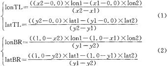 假设在地图边界内部有两个任意点,把这两个点称为“参考点”,并且已知这两个参考点的经度、纬度、归一化x坐标、归一化y坐标;设参考点1的这4个参数为point1=(lon1,lat1,x1,y1),参考点2的这4个参数为point2=(lon2,lat2,x2,y2),即pointl和point2已知。根据前面的说明可知,左上角点的归一化坐标为(0.0,0.0),而右下角点的归一化坐标为(1.0,1.0)。另外假设左上角点用pointTL表示,其经纬度为lonTL和latTL;右下角点用pointBR表示,其经纬度为lonBR和latBR(TL意即Topleft,BR意即BottomRight),则有pointTL=(lonTL,latTL,0.0,0.0)。同理,对于右下角的点有pointBR=(lonBR,latBR,1.0,1.0)。