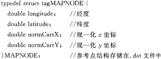 上述过程是在GPS数据处理模块初始化过程中完成的。为了提高系统的灵活性和可靠性,参考点数据都是存放在外部数据文件中的,因此,需要在程序启动时将相应的数据读入到内存中。为此,专门为参考点定义了一个数据结构(gpx2xy.h):