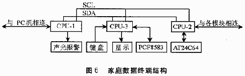 家庭数据终端是安装在家庭内部的1个监控节点,主要执行以下任务:(1)接收PC机发来的命令;(2)信息显示;(3)键盘扫描;(4)声光报警;(5)生成家庭状态字节,并向PC机发送各种状态信息;(6)报警信息储存,即“黑匣子”功能;(7)扫描各传感器模块状态。另外,HDT还应个有可添加扩展模块的功能。这些功能当然可以用1个CPU实现,但将给CPU带来较大的工作量,降低了系统的安全性和可靠性。因此,我们采用多CPU的思想进行系统的设计。