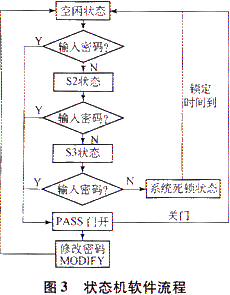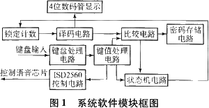 在本系统中,密码由4位十进制数组成,初始密码为“0000”,可由用户任意设定密码。密码输入正确时,则进入开锁状态。如果密码连续输入3次错误时,则系统进入自我定时锁定,并报警。在输入过程中,系统可以发音提示(也可屏蔽掉)用户输入的数字,或者说明当前的状态。