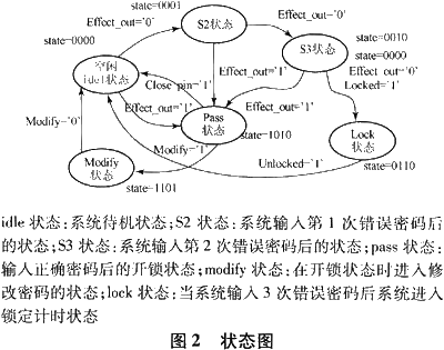 其中state为状态代码,并通过state_out[3..0]端口传给其他电路。一开机,系统处在空闲状态,当按键处理电路传来确定使能的信号compare_en时,状态机等待effect_out脚的高电平脉冲信号,如果等不到则进入S2状态,即进入密码输入一次错误状态,如果等到则进入pass状态即开门状态,如果3次输入密码错误则系统进入死锁倒计时状态,拉高lock_pin脚,启动计数器。
