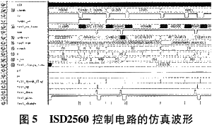 本设计采用计数器方法在ce脚上产生一个低电平脉冲以控制ISD2560芯片放录音。当innum收到一个新的数值时,则开始计数;当计数器计到一半时,使ce脚输出低电平;当计数大于最高数的一半时,则复位ce脚电平,直到下次计数开始。当语音数据有多段时,先将要播放的语音段数存到一个变量中,并将各段地址存到另一个多位的变量中,然后开始放音并检测eom脚的电平。当检测到eom脚的低电平脉冲时,就表明放音结束,就让段数变量减1,然后给地址线再赋新值,并且使能计数器,再次使ce脚产生一个低电平脉冲,继续放音。这样直至语音段数变量为0时,则表明语音播放完毕,系统不再响应芯片eom脚的上升沿脉冲。图5为ISD2560控制电路的仿真波形图。