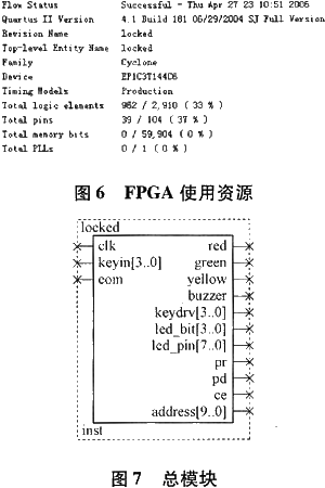 本设计采用模块化编程,各模块分工明确,各自实现各自的功能,并通过信号线彼此相连,这样的好处是调试、修改、移植程序方便。使用资源和生成总的模块电路图分别如图6和图7所示。