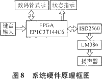 硬件部分主要包括中央处理器FPGA 芯片——EP1C3T144C6、输入小键盘、输出4位数码管、ISD2560语音芯片、LM386音频放大和扬声器,如图8所示。FPGA芯片用米直接控制其他元件的工作,对小键盘的输入,通过一定的算法实现电子密码锁的功能。通过控制ISD2560的控制脚的电平状态,达到控制其发音从而实现智能语音提示的效果。3个发光二极管分别用于显示当前的状态,蜂鸣器用于误码报警。
