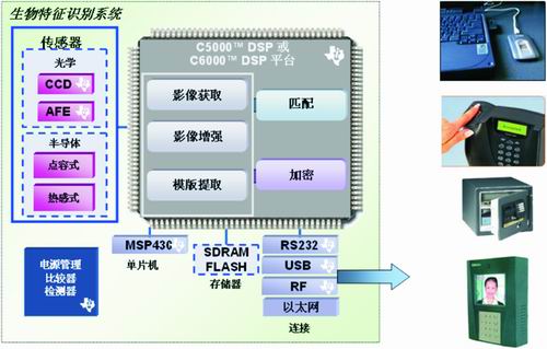 如图1所示生物特征识别系统是一个典型的高速影像处理系统,首先其核心处理包括影像获取、影像增强和模版提取,然后进行匹配和加密,所有这些复杂的工作都需要在瞬间实现,如果没有DSP的高速则难以胜任。其次其周边包含传感、存储、外设、供电和主控单元,整体耗电量要求尽可能低,因此TI的DSP的低功耗和MSP430的超低功耗特性得天独厚,另外还可得益于TI的高性能电源等其它器件器件。当系统的高速和省电需求得到充分满足之后,生物特征识别产品市场化的进程便得到迅猛的发展。