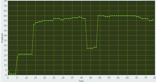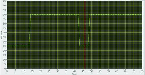 由于白线对应的电平值较高,而黑线电平值较低,因此图中第43到48点间的凹槽就是黑线所在位置。为了提取出黑线,直观的想法是检测电平值的跳变。但实际黑白线边沿的电平经常不是突然跳变的,而有一个过渡过程,为此我们先对原始数据进行了二值化处理。这不仅使得边沿更加明显,而且可以去除电平值的一些小波动。二值化的结果如图2所示。