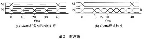 Giotto任务是一项剧期性的工作,其输入和输出端几分别在任务周期的启动和结束时更新,但Giotto任务不一定要在周期开始时启动,只需在周期内启动和完成。图2(a)显示了运行在同一个CPU上的1个40ms任务M和1个10ms任务N的时序,虚线为目前任务占用CPU的可能情况。在第Oms,M和N都读取它们输入端口的值;在第10 ms,任务N的计算结果写入它的输出端口,但是N早已结束执行(如图中虚线所示);在第40 ms,任务M的计算结果写入它的输出端口,但任务M在第40ms之前已经完成执行。无论任务M在0~40 ms的任何时间完成计算,任务N都只会在第40 ms读其结果。