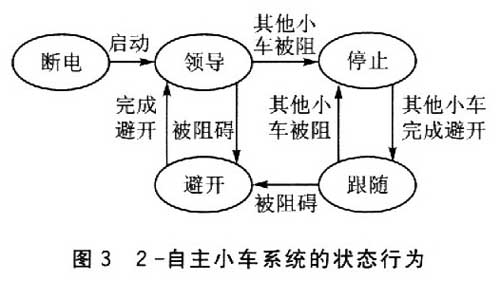 系统分别对自主小车l和2的传感器不断地进行检测。当自主小车1被阻碍时,系统转换到stopl模式。两个自主小车都停止移动;完成stopl模式之后系统转换为EvadelStop模式.此时自主小车l执行 避开程序而自主小车2停止不动。类似地,当自主小车2被阻碍时,自主小车2经过stop2模式后转换到Evade2Stop模式。在EvadelStop模式下,Evadel任务每一周期计算一次避开动作是否完成以及避开的下一步动作;具有10ms周期的任务trailerCtrl根据command中避开的步骤去控制自主小车1的马达,一旦完成避开动作,就转换为LeadlFollow模式。