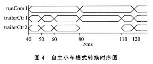 图4为系统从LeadlFollow模式到stopl模式,EvadelStop模式和LeadlFollow模式的模式转换时序图。到stopl模式的转换发生在LeadlFollow模式下的第60 ms,自主小车l的传感器检测到障碍,系统由LeadlFollow模式转换为stopl模式.两个自主小车执行停止程序;完成stopl模式后,在第80 ms系统转换为另外一个模式EvadelStop,自主小车1的控任务立刻被调用,自主小车l执行避开程序,此时自主小车2仍停止;当自主小车1完成避开动作后,在第110ms,两个自主小车的控制任务立刻被调用,系统转换为LeadlFollow模式。当自主小车2是领导者时,其模式转换类似。