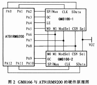 GM8166共有三大功能,满足三种不同应用。申并/并串转换功能为并行口比较紧张的系统通过串口扩展32位并行口;并行口切换功能可以将l组8位并行口扩展成3组8位并行口,通过控制信号在3组并口中切换完成输入/输出功能;SPI总线功能使该器件可以接入SPI总线中作为从设备进行数据收/发,同样完成串并转换的功能。这里笔者采用两个GM8166器件分别实现32位数据的并行输入串行输出转换和32位数据的串行输入并行输出转换,扩展为64位I/O口,从而实现对锅炉控制系统数字量输入输出信号的控制与传输。GM8166与AT9lRM9200的硬件原理图如图2。