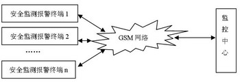 本系统的结构如图1所示。系统由安全监测报警终端,GSM无线网络和监控中心三部分组成。安全监测报警终端通过传感器检测安全指标,利用GSM无线网络进行实时的数据传输,将报警信息发送给监控中心。另一方面,监控中心可以向安全监测报警终端发送查询和控制短信命令,安全监测报警终端收到命令后,将根据命令要求返回当前的状态信息给监控中心或实现相应的操作,如打开排风扇、关闭除湿机等。
