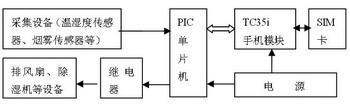 安全监测报警终端主要包括主控制器PIC18F452单片机、TC35i无线通信模块、各种传感器(温湿度传感器、烟雾传感器等)、继电器控制开关,其结构如图2所示。系统采用PIC18F452单片机为核心,配合各种传感器作为采集设备,用以检测各种安全信息,当出现警报时,通过TC35i模块给管理员手机发送报警短信或打电话。管理员通过手机发送的控制命令也是通过GSM网络到达TC35i,再传到单片机,单片机分析处理后,再执行相应的操作。其中,单片机采用串行通信口与TC35i通信,通过固态继电器控制排风扇等设备。TC35i和SIM(Subscriber Identification Module)卡之间主要通过CCCLK和CCIO两根信号线进行数据通信。