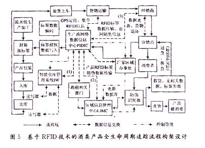 厂家通过EPC标签可对酒类产品的生产、流通、销售和防伪识别过程进行追踪,能获取酒类产品全生命周期内的信息,基于RFID技术的酒类产品全生命周期追踪流程构架设计如图5所示。