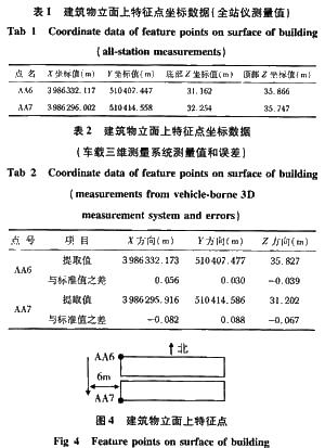 该实验在山东科技大学北门进行,载体速度适当,路面比较平坦。首先,利用全站仪精确量测标志点(AA6和AA7)的坐标,结果见表1。然后,再利用该车载三维测量系统对相同的标志点进行了测量,得到相应的测量结果和与标准值(全站仪获取坐标)之间的误差值,见表2。建筑物立面上特征点如图4所示。