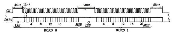 容栅数显卡尺采用串行数据采集,其中数据线波形见图2所示。在最快20ms的周期内,包括一个下述数据采集周期。每个周期输出两组数据,其中第一组为绝对值,第二组为相对值,在本系统中我们采用第二组数值。每组数值包括24个二进制位,其中前13位为整数位,后11位为小数位,换算后的数据单位为0.1inch。