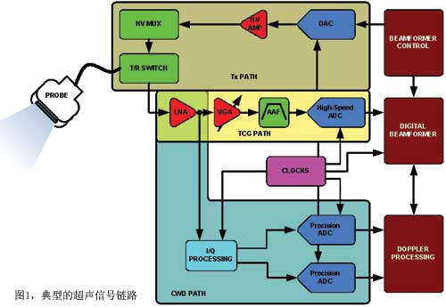 现今大部分超声系统公司将其大部分知识产权(IP)应用于探针和波束成形技术,使用多通道集成的常用器件,包括四通道和八通道ADC来完成系统,消除了对高成本元器件的需要,而且简化了独立TGC路径的调整和优化。此外,也可以考虑进一步集成超声系统的其它部分。在生产能力许可且市场导向目标适当的前提下,这些其它信号链路部分的集成将是有利的。