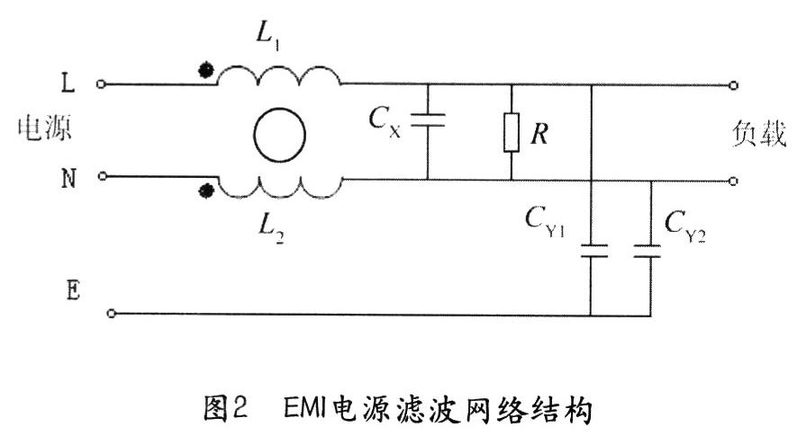 图2所示为单相电源滤波器的基本网络结构。它是由集中参数元件构成的无源低通网络,滤波网络主要由两只电感L1和L2,三只电容CX、CY1、CY2组成。如果把该滤波器一端接入电源,负载端接上被干扰设备,那么L1和CY1,L2和CY2就分别构成L—E和N—E两对独立端口间的低通滤波器,用来抑制电源线上存在的共模EMI信号。此外,L1、L2又与CX构成L—N独立端口之间的低通滤波器,抑制差模干扰信号。
