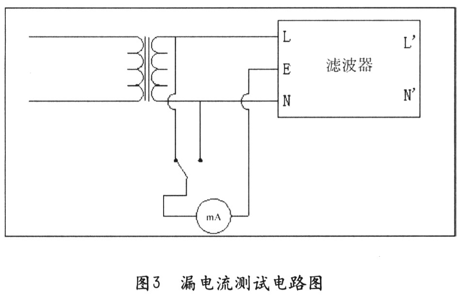 泄漏电流是指在250VAC的电压下,相线和中线与滤波器外壳(地线)间流过的电流。它主要取决于接地电容(共模电容)的取值。较大的共模电容CY可以提高插入损耗,但却造成较大的漏电流。泄漏电流的测试电路如图3所示: