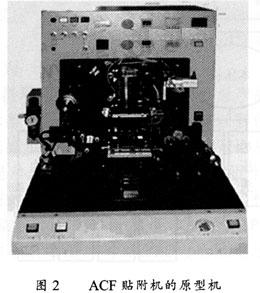 ACF 在驱动装置的作用下,完成供给、剪切和剥离等动作。供给由电机提供动力,剪切剥离由气缸提供动力。在支持平台上,热压头由气缸驱动垂直运动,实现ACF和玻璃基板的贴附。在上述贴附过程中,热压头的温度通过PID等方式精密恒温控制。温度约为200℃,可以1℃为单位精确设定。同时热压头的压力也可精确控制和调整。特别重要的是热压头和支持平台的压合位置精度,例如平面度必须保持在±6μm以内。ACF贴附机的原型机如图2所示。