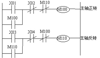 (2) 动作互锁原则:有些控制不能同时动作,就要进行互锁。如主轴正、反转控制,图 3为主轴互锁控制示意图,任何一个回路启动后必须同时关断另一 个回路,从而保证两者不能同时动作。
