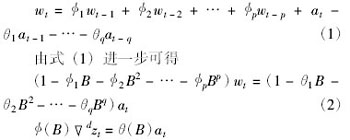 式中,B为后移算子,▽为差分算子。记为Bkzt=zt-k。这样,一个非平稳时间序列经过d次差分后转化成一个平稳的时间序列,然后就可以用平稳的时间序列模型ARIMA来表示。